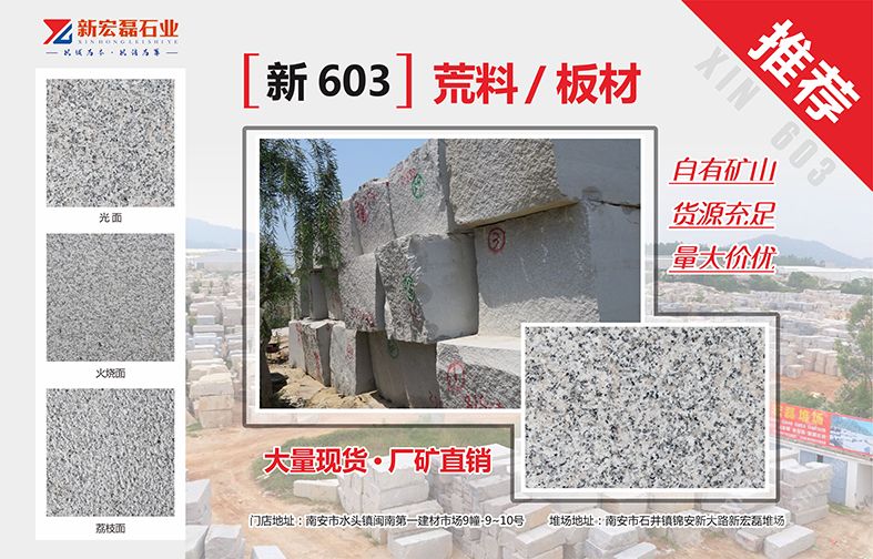 新宏磊石業(yè)有限公司自有礦山,荒料堆場(chǎng)50余畝,有花崗巖和大理石加工廠,是集礦山開(kāi)采、板材生產(chǎn)加工、銷售出口為一體的綜合性石材供應(yīng)商,在石材行業(yè)已經(jīng)擁有10年以上的生產(chǎn)與銷售經(jīng)驗(yàn)。