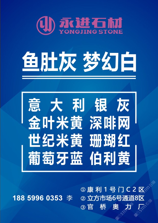 永進石材主營:魚肚灰,夢幻白,土耳其愛馬仕灰,意大利銀灰,金葉米黃、深啡網(wǎng)、世紀米黃、珊瑚紅、伯利黃、葡萄牙藍;