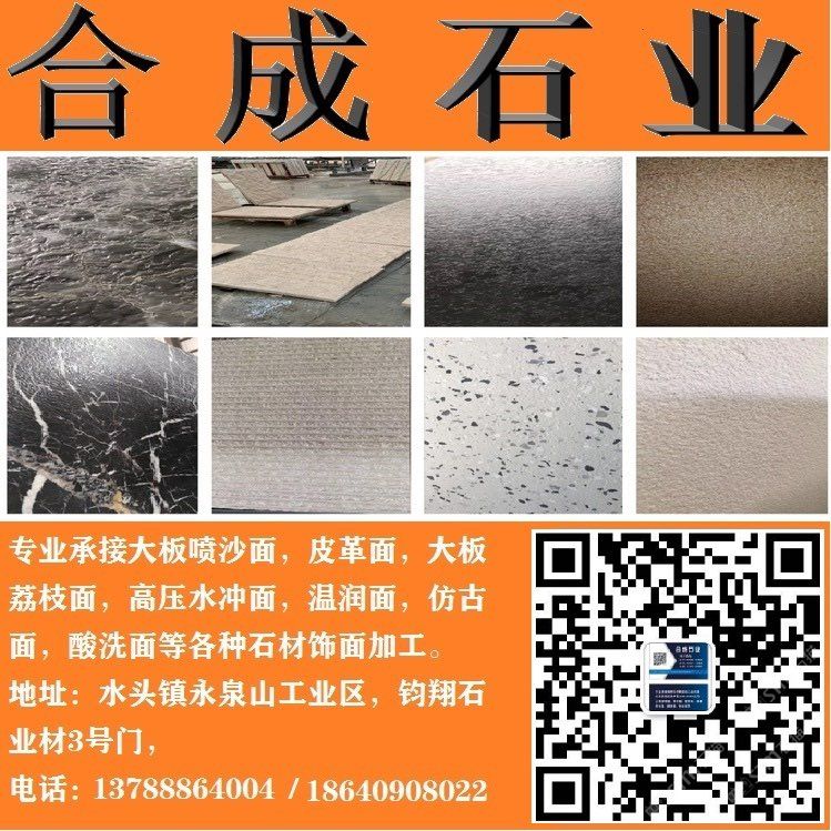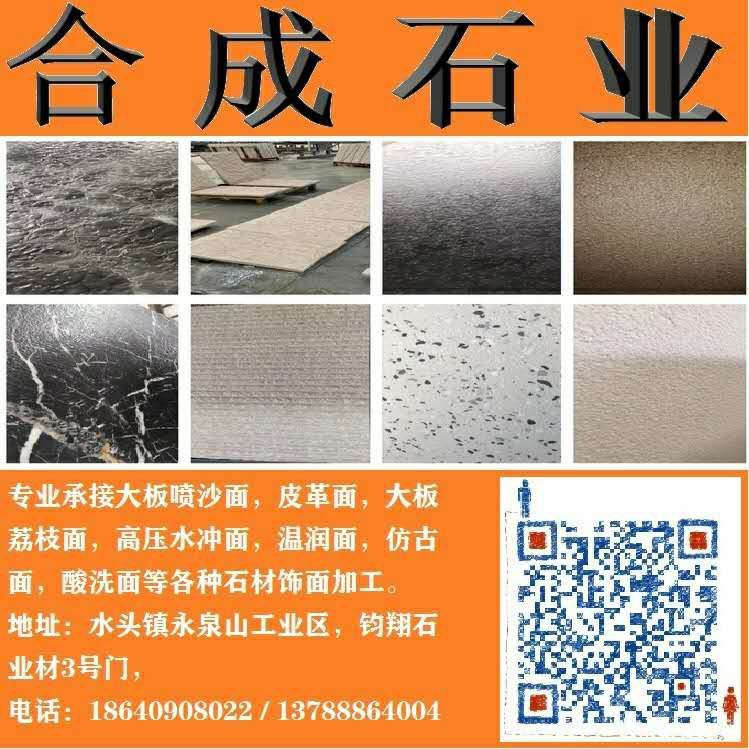 專業(yè)承接皮革面、溫潤面、噴沙面,鋼砂面、高壓水沖面,大板荔枝面,自動火燒面,斧鑿面(龍眼面),對破自然面,仿古面等各種飾面加面