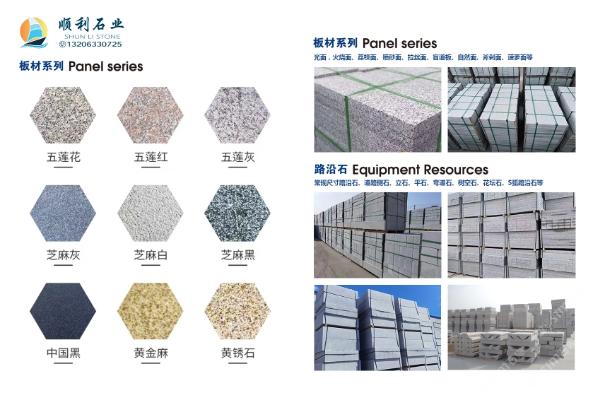 產(chǎn)品有五蓮紅、五蓮花、五蓮灰、芝麻灰、黃金麻、芝麻白、芝麻灰、山東白麻、櫻花紅、珍珠花等多種花崗巖板材,臺(tái)階石、路沿石、 S 型路沿石,異型路沿石,弧形彎道石,蘑菇石、火燒板、機(jī)刨板、等各種異形石材。多年來,產(chǎn)品銷往全國各地。五蓮花崗巖板材被評(píng)為省優(yōu)、部優(yōu)產(chǎn)品。并得到了廣大用戶的認(rèn)可及社會(huì)各界的好評(píng)。