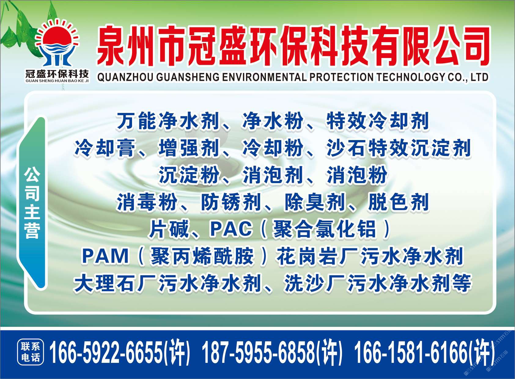 發(fā)布信息: 冠盛環(huán)??萍?6659226655 主營產(chǎn)品:凈水劑,冷卻劑,冷卻粉,大理石人造石專用凈水劑,沉淀粉,消泡劑,消毒凈水劑,防銹凈水劑,除銹劑,除臭劑,聚丙烯酰胺,聚合氯化鋁,鹵精,洗沙專用凈水劑,壓濾機專用凈水劑,陶瓷廠專用凈水劑(黃藥 白藥)等所有水處理環(huán)保材料……