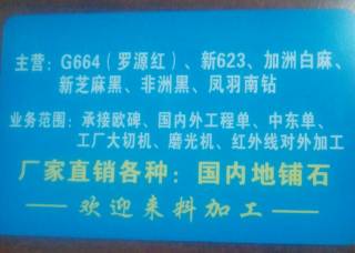 創(chuàng)石紀(jì)石材有限公司主營產(chǎn)品:金山麻,安哥拉黑,世貿(mào)金麻,白世貿(mào)(老礦),紫點金麻(大花),紫點金麻,太平洋暖灰,云朵拉灰(新礦)1,幻影灰,幻影灰1,英國棕(黑紅),英國棕(黑底),幻影藍,安哥拉棕1,安哥拉棕( 黑底),安哥拉棕2企業(yè)地址:福建泉州南安市新街南路來發(fā)石業(yè)有限公司